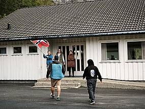 Schließlich, nach ein paar Kilometern ungeteerter Straße kamen wir vor der Unterkunft an: kein Zweifel, wir waren in Norwegen, denn abgesehen von den weißen Holzhäusern schwenkte auch ein kleines Empfangskomitee die norwegische Flagge.