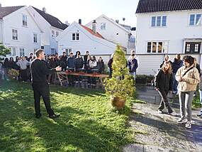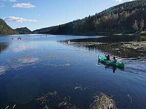 Der Dienstagvormittag stand unter dem Vorzeichen des Kennenlernens von Flekkefjord. Unter Führung von Flekkefjorder Schülerinnen und Schüler gingen wir auf „Headhunting“ in der Stadt und lernten so einiges über die Stadt, Streetart und wichtige Persönlichkeiten. Und da die Sonne Überstunden machte, fuhren wir zurück zum See der mit seinen coolen 11°C zum Baden und Kanufahren einlud.
