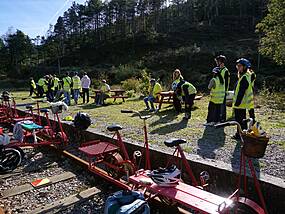 Das Highlight des Tages war jedoch sicherlich unsere Draisinenfahrt auf der alten Bahnlinie. Dabei ging es am Fjord entlang über einige Brücken und durch zahlreiche Tunnels, an Wasserfällen vorbei zum höchsten Punkt, 88 m über dem Meerespiegel, was ein ausgiebigeres Picknick unvermeidbar machte. Mit einer Koalition der Willigen fuhren zwei Lehrkräfte anschließend noch etwas weiter an einem See entlang, während die müderen Teams noch etwas ausruhten um die deutlich leichtere und schnellere Rückfahrt anzutreten.