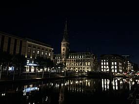 Anreise nach Hamburg – Abenteuer und erste Eindrücke Der Anreisetag verlief bereits etwas abenteuerlich. In Appenweier wurden wir Zeugen eines Polizeieinsatzes, als ein Fahrgast ohne Ticket auf die Kontrolleure losging. Weiter ging es nach Mannheim, wo einige Schüler:innen der Polizei als Zeugen eines Vorfalls mit nazifreundlichen Parolen im Zug berichteten. Nach längeren Verzögerungen aufgrund von Oberleitungsstörungen bei der Deutschen Bahn erreichten wir schließlich Hamburg mit über zweistündiger Verspätung. Nach dem Check-in im Generator Hostel, das sich hervorragend für unsere Aktivitäten in der Nähe des Hauptbahnhofs eignete, machten wir uns auf den Weg zum Jungfernstieg an der Alster. Hier konnten wir nicht nur die Atmosphäre Hamburgs bei Nacht genießen, sondern auch das beeindruckend beleuchtete Hamburger Rathaus bewundern.